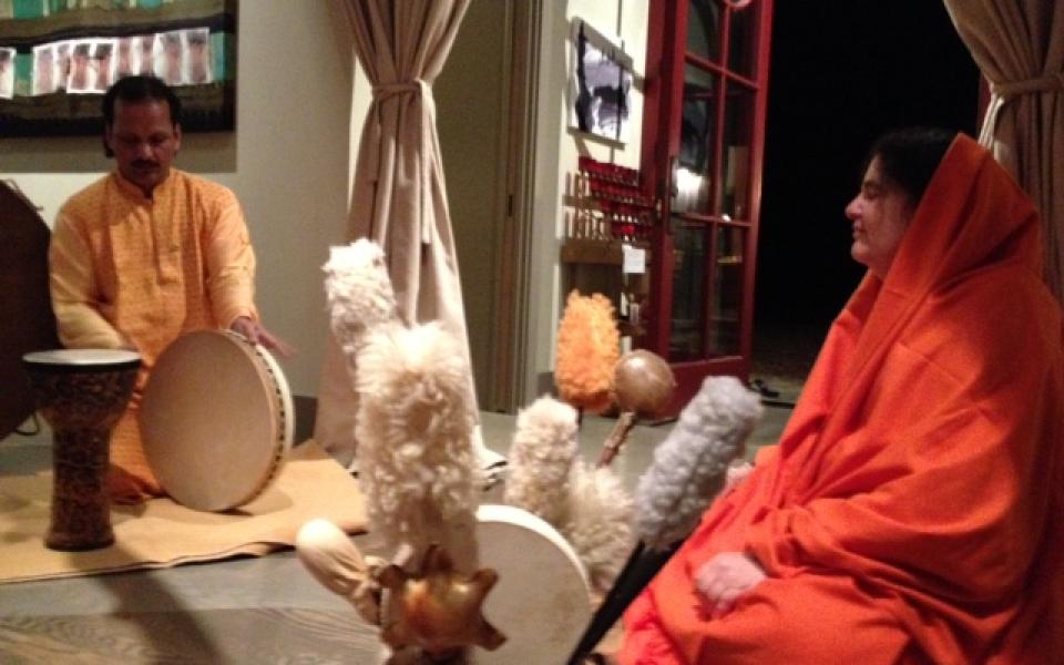 URI Asia Regional Coordinator Biswadeb Chakraborty plays URI supporter Nikki Johnson's drum in her home in front of Swamini Adityananda Saraswati and others