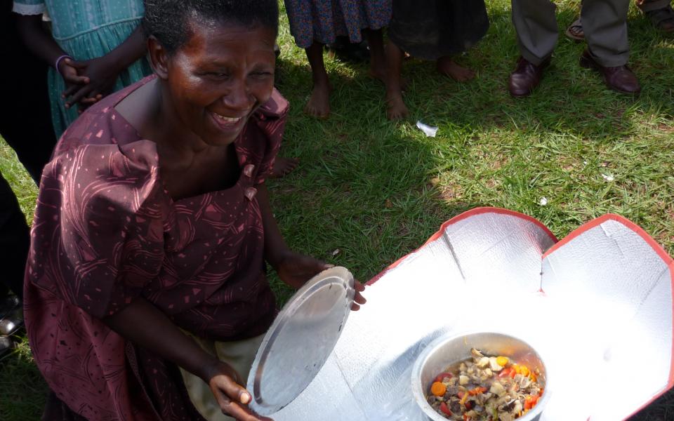 A Ugandan woman unveils the results of her dish cooked through solar power during a demonstration with partner Solar Cookers International. This initiative was made possible in part through the efforts of URI Africa staff Despina Namwembe and Hannington Wako, and members of SARAH CC in the US.