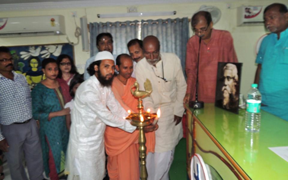 Hindu, Muslim, Budhhist, and Christian participants light the lamp together
