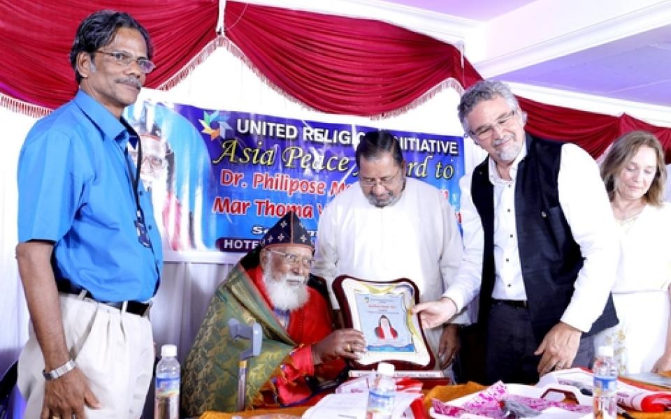 It was historic and exciting. Victor Kazanjian, URI International Executive Director, presented the first URI Asia Peace award to Most. Rev. Dr. Philipose Mar Chrysostom Mar Thoma Valiya Metropolitan. The award consisted of 25,000 rupees and a citation. Chrysostom could be the longest-living bishop in the world, as he was anointed as a bishop in 1953.