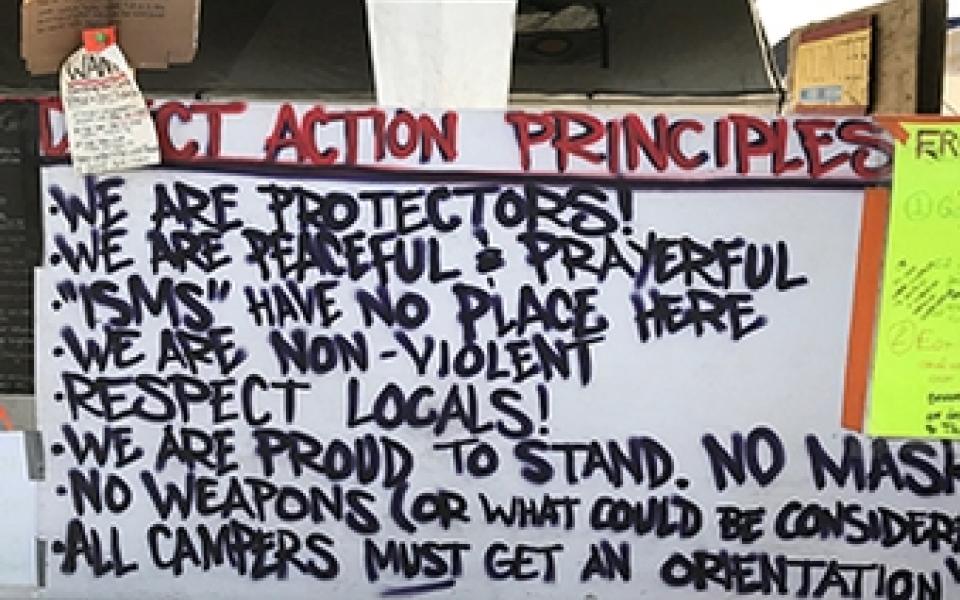 Standards of conduct are displayed by the Sacred Fire at Oceti Sakowin Camp.
