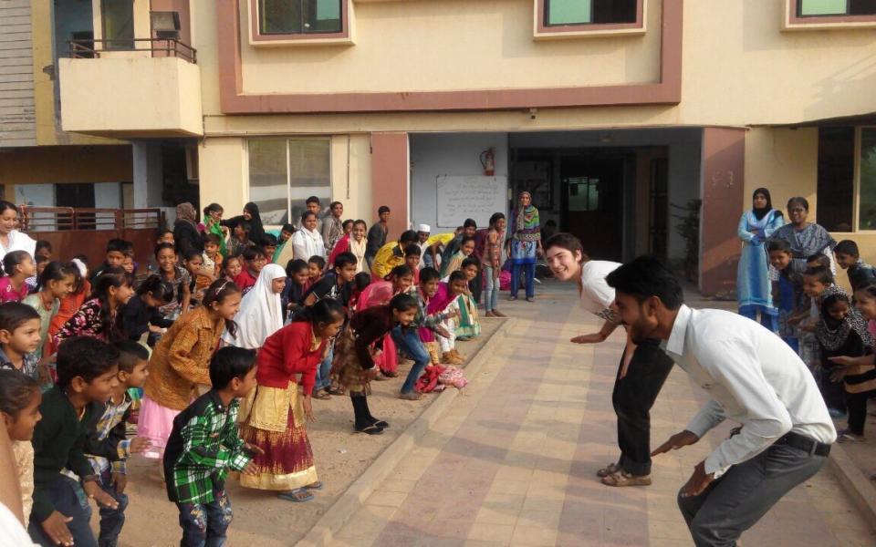 Environmental Coordinator, Katherine, and Youth Ambassador, Sakhawate, play a warm-up game with 200 students from The Apollo International School in Ahmedabad, India (West Zone) during a URI Environmental Workshop.