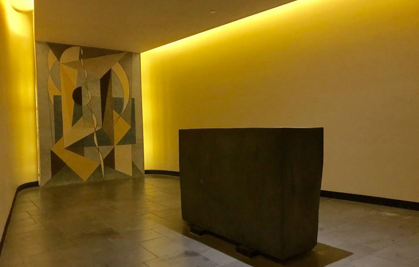My most memorable experiences from the trip (photos below) include eating slices of NY-style cheese pizza on Broadway and photographing the art, architecture, and sculptures around Manhattan. Among my favorites are the “Architect” at 30 Rock, the “Star of Faith” and “Aquarian waterbearer” at the United Palace, and the subway posters for “Paintings for the Future.” The United Nations Headquarters building itself concretely expresses the human aspiration for peace; the courtyard sculptures express the wish for abolition of nuclear weapons and war; the murals in the meeting rooms and halls are esoteric and otherworldly.