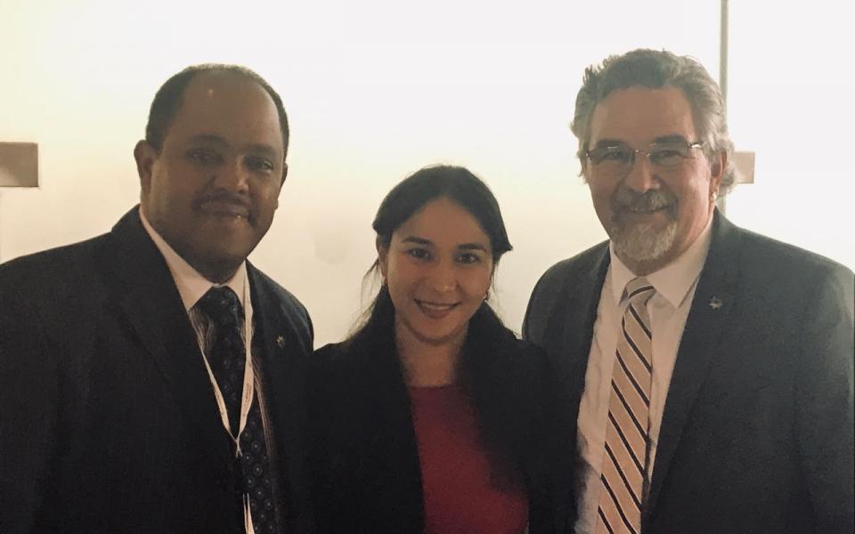 From left: Mussie Hailu, URI Director of Global Partnerships; Mrs. Maria Lucia Uribe Torre, Director of Arigatou International Geneva; and The Rev. Victor H. Kazanjian, Jr, Executive Director of URI.