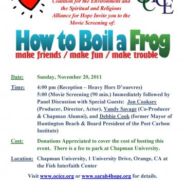 Orange County Interfaith Coalition for the Environment Cooperation Circle (CC) represents many different faith traditions—all of which have a passion for protecting the earth. One highlight from this CC is the Caring for Creation Conference held annually in October, which features environmental exhibits and workshops. Their main focus now is global warming. Members educate and empower people to do what they can for the environment. Each board member has a special interest and leads their efforts in those areas. Their programs include: toxics in home and yard; how to start enviro ministry in church; basic stewardship things individuals can do; creation spirituality; energy issues; and transportation alternatives.